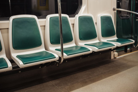 Several empty green and white seats line the interior of a subway train, showcasing a quiet moment during off-peak hours in the city.