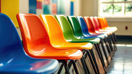 A row of colorful plastic chairs in a bright classroom setting, showcasing vibrant hues that enhance learning environments and promote creativity.