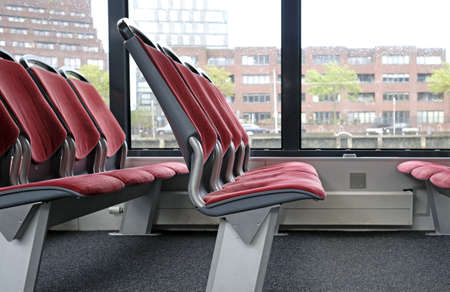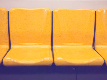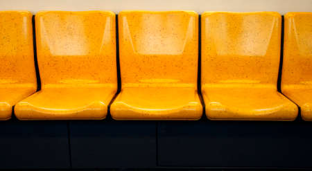 Rows of an empty orange plastic seats in railway station. empty seats.