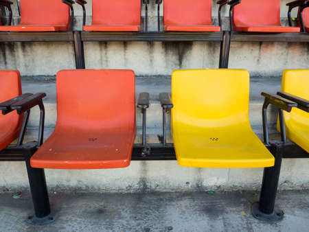 Empty plastic seats in a stadium. Matches to be played without fans.