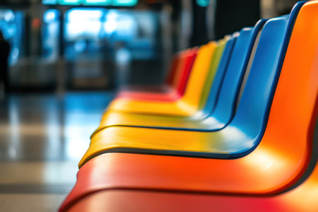 Brightly colored passenger seats arranged in rows at a public space, evoking readiness and structured modern infrastructure.