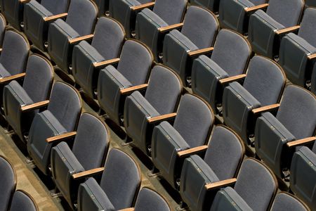 Rows of blue chairs in perspective, public interior, empty concert hall, top view