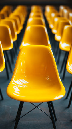 A row of bright yellow chairs is lined up in a modern interior space, showing their sleek design and vibrant color.