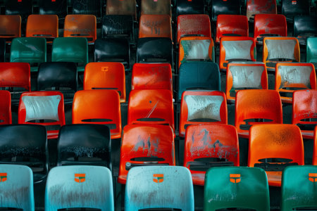 Abandoned sports stadium seats in disarray, symbol of loss. Weathered texture for poster and background design.
