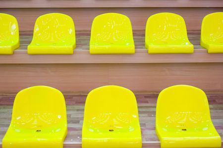 two rows of yellow plastic seats in a school gym, focus on the upper row