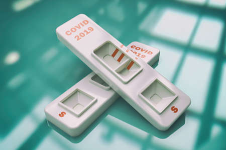 COVID19 SARS virus quick test. Two Rapid Covid 19 test on board. 3d illustration. Tests are effective in detection of production of antibodies including IgM and IgG