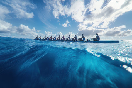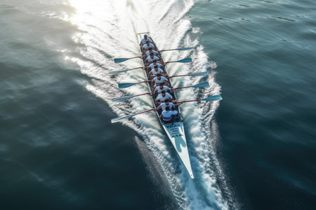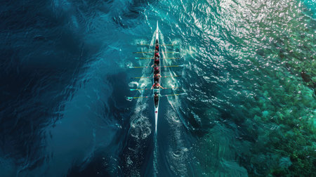 Aerial view of a racing boat in the middle of the sea, A bird's-eye view of a rowing team in perfect sync, AI Generated