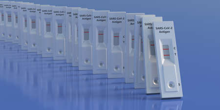 self testing at home, rapid tests, kits for detecting antibodies. Positive and negative result antigen self tests on blue color background, 3d illustration