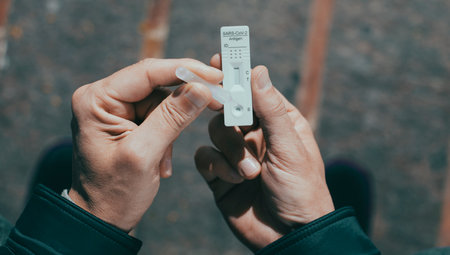 Hand is showing positive results on test strip for rapid antigen home Covid-19 test kit at home.