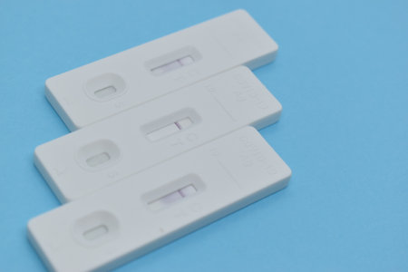 Two Covid-19 tests: one negative, one positive on the right. Blue background. Copy space.