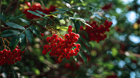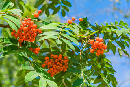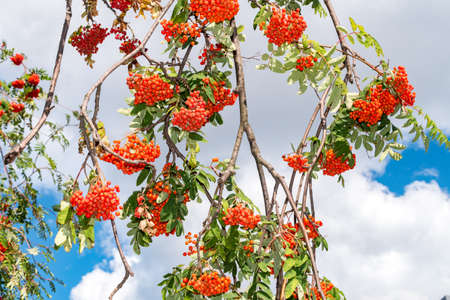Bunches of ripe rowan berries on branches of rowan tree on sunny day