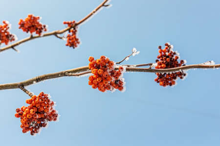 branches of rowan with berries on a cold winter day