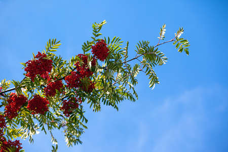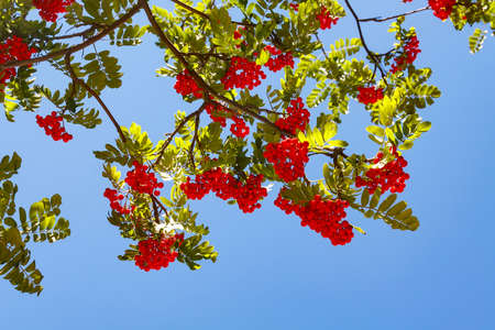 Red rowan berries on the branches of tree and green leaves against blue sky
