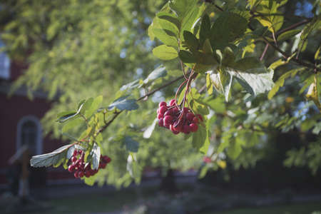 The Rowan berry in summer, Bright sunlight pierces dense foliage, the air feels hot, natural color