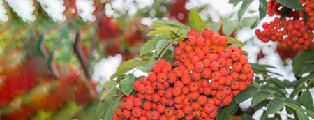 Red bright ripe Rowan berries on nature autumn background. fall season concept. copy space. Fall season backdrop.banner