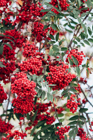 Rowan berries red hanging on the branches of a tree in the fall. Natural background.