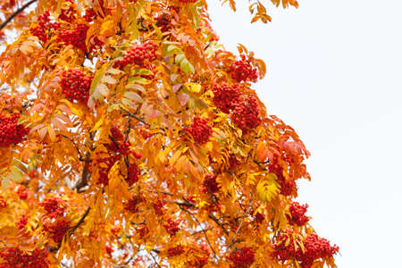 Autumn colors. Bunches of ripe rowan berries on a background of blue sky.