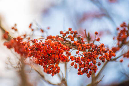 Red rowan on the branch against a blue sky. Red rowan tree. Nature background. Autumn concept