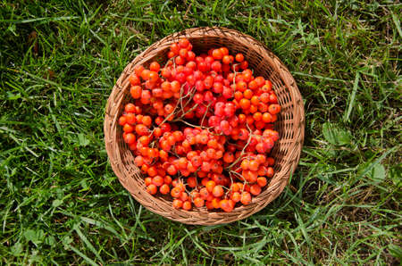 red rowan berry in wicker plate on summer end garden grass