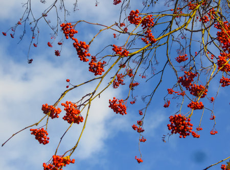 Red berries on a tree against blue sky. Autumn nature