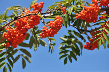 Ripe rowan fruits on the tree with blue sky background, Sorbus aucuparia