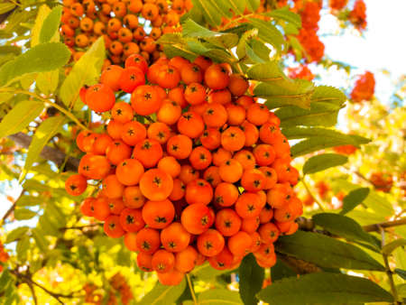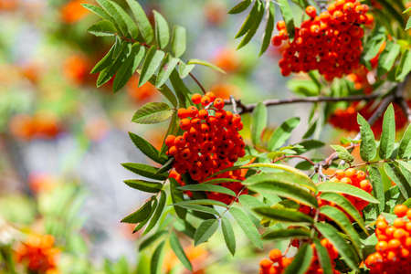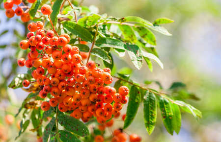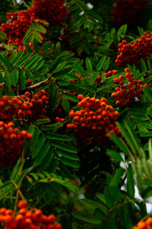 Bunches of ripe rowan berries on branches of rowan tree on sunny day