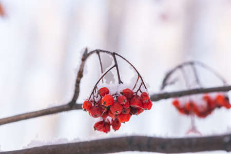Beautiful rowan fruits on a branch covered with first snow.