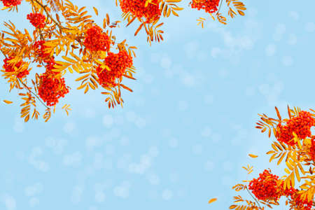 Autumn colors. Bunches of ripe rowan berries on a background of blue sky.