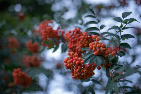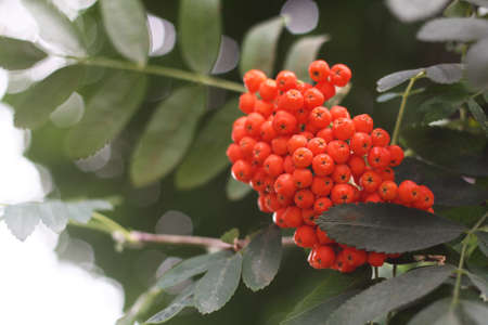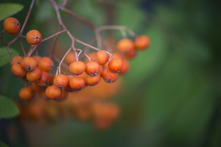 Cluster of a ripening rowan berries, nature bokeh. High quality photo