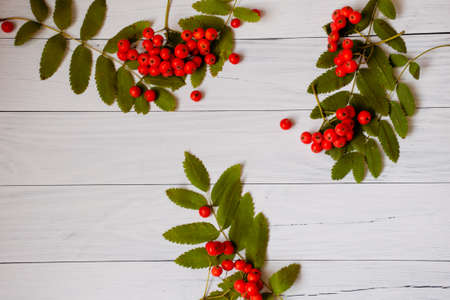 Rowan berries and leaves on white wooden table, flat lay.