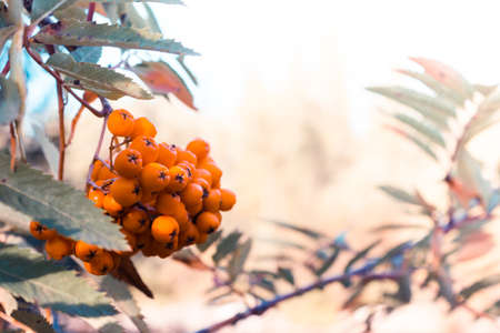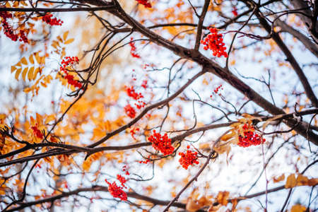 Rowan berries, Sorbus aucuparia, tree mountain ash. autumn landscape with bright colorful foliage. Indian summer.