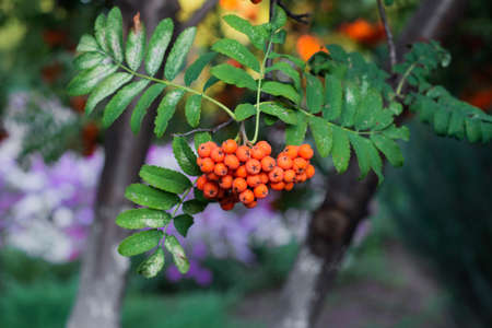 Rowan berries on a branch in the autumn park.