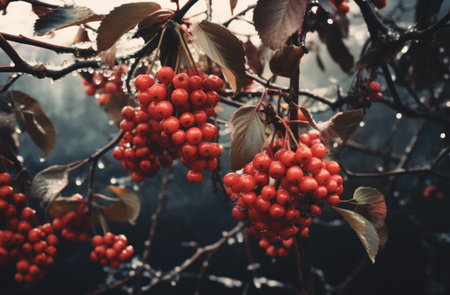 Moody autumnal dry tree branches with red wild berries on blurred dark background.