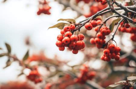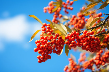 Ethereal Autumn Beauty: Red Rowan Berries Dancing Amidst a Blue Sky