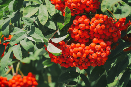 Bright red mountain ash berries on a branch in autumn, vintage colors.