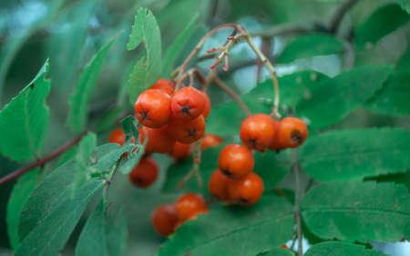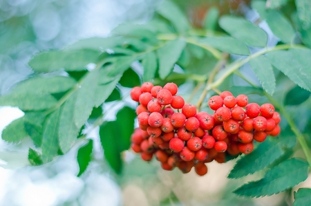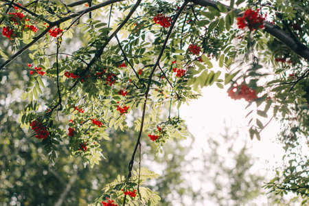 Fruits of mountain ash on a bright sunny day in the forest. Focus on a bunch of rowan. Shallow depth of field