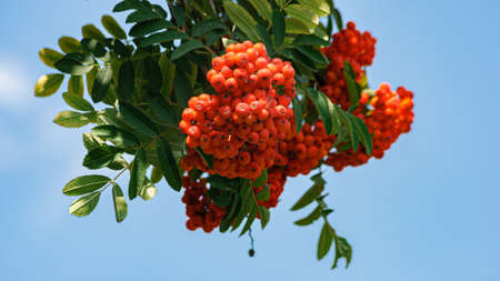 Ripe rowan fruits on the tree with blue sky background, Sorbus aucuparia