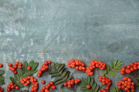 Fresh ripe rowan berries and green leaves on light blue wooden table, flat lay. Space for text