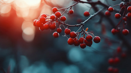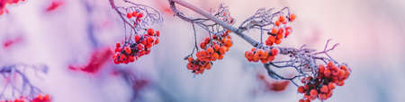 rowanberries covered with hoarfrost in the winter morning, seasonal photo