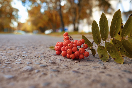 a Rowan brush lying on an asphalt path in autumn, the background is blurred by the city