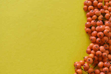 rowan branch on a yellow background, orange rowan berries with green leaves. background for text