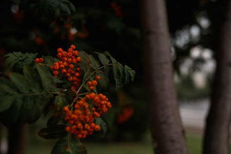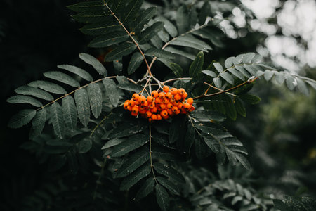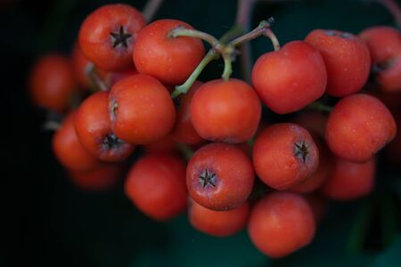 Red rowan on tree outdoors. Close-up, low key, dark green tone.