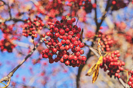 Autumn red rowan berries on a tree. Rowanberry ashberry in the fall in natural setting on blue sky background. Sorbus aucuparia.