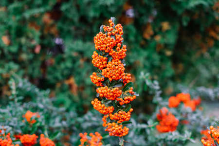 Rowanberries sour but rich vitamin C. Pyracantha plant, also known as firethorn in a garden in a sunny autumn day, beautiful outdoor floral background photographed with soft focus