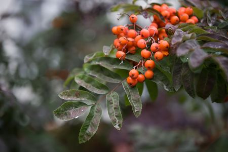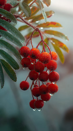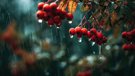 Soft rain falling gently on Rowan berry, with water droplets forming and slowly dripping. The background is softly blurred with a natural, moody atmosphere.