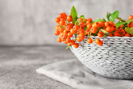 Basket with ripe rowan berries on grunge background, closeup