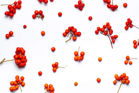 Ripe rowan berries pattern on white, top view