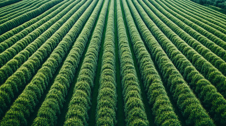 This captivating aerial photograph showcases lush green rows of a vineyard, illustrating the beauty of agriculture in a serene rural landscape. The vibrant hues and well-structured rows indicate a healthy crop.