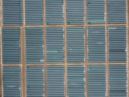 Aerial view of farmland and rows of crops. Green seedlings in rows in the greenhouse of Italy