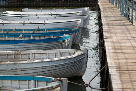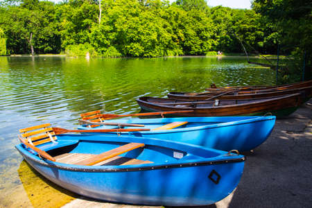 Wooden pleasure rowboat at the pier of a lake for rent. Municipal city park. Hamburg